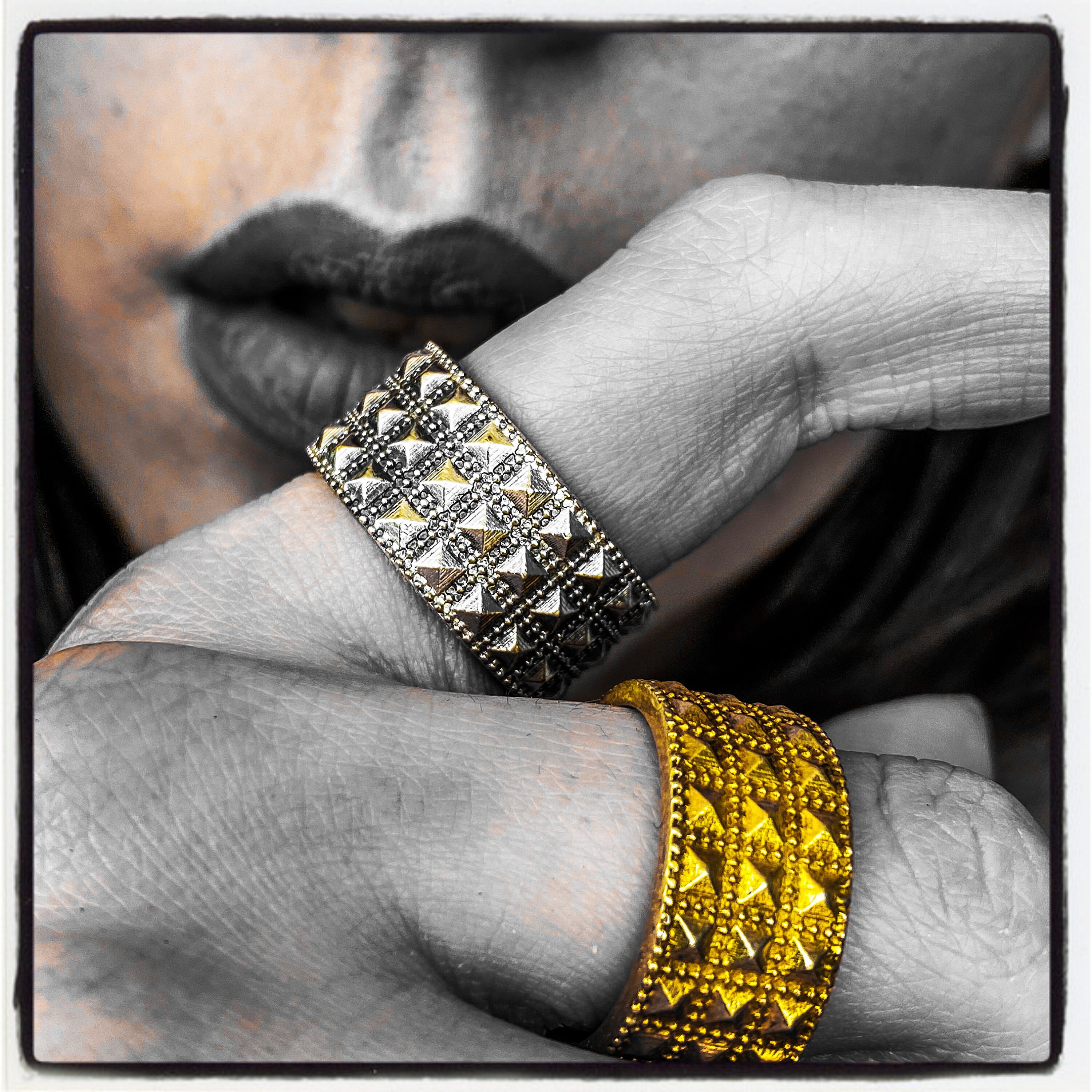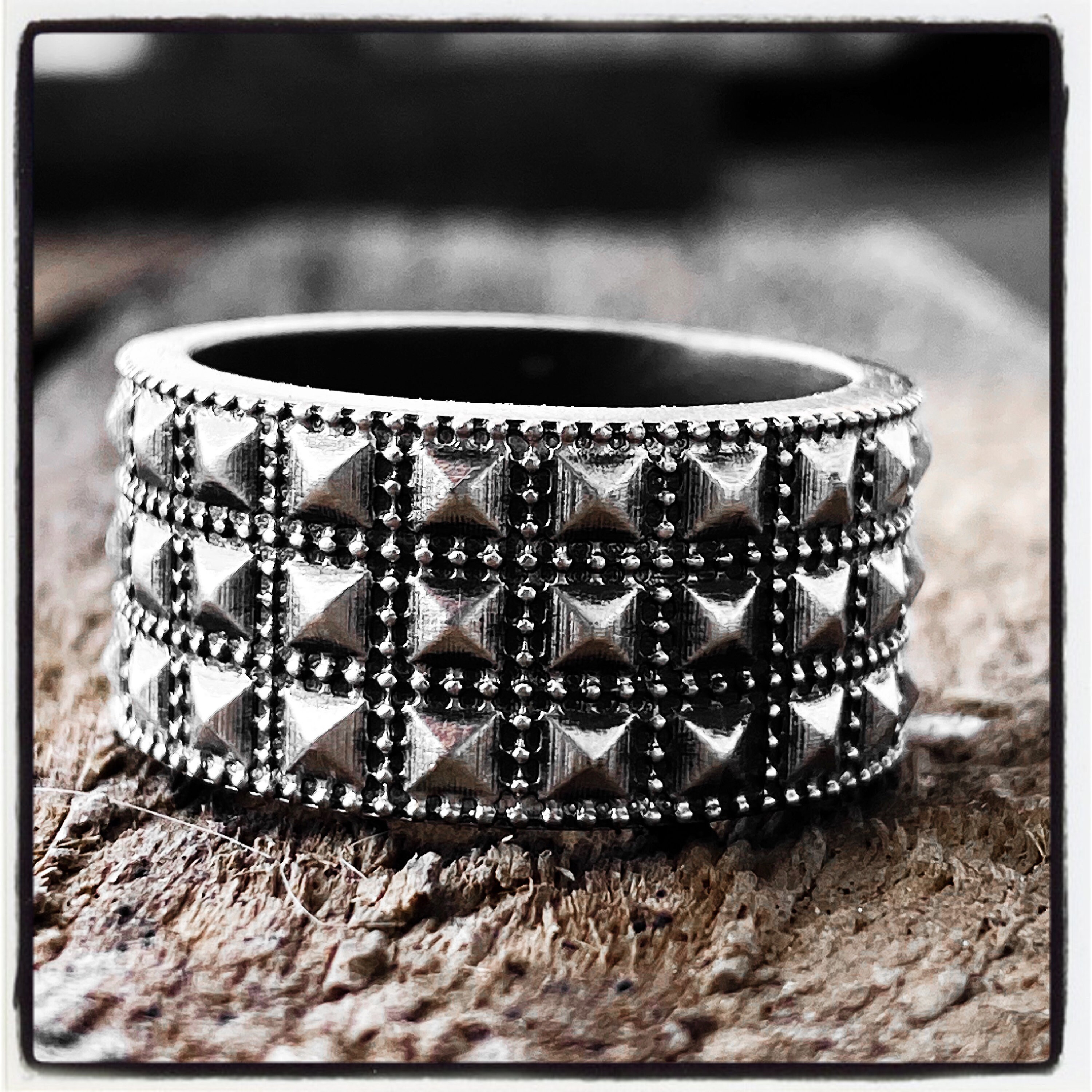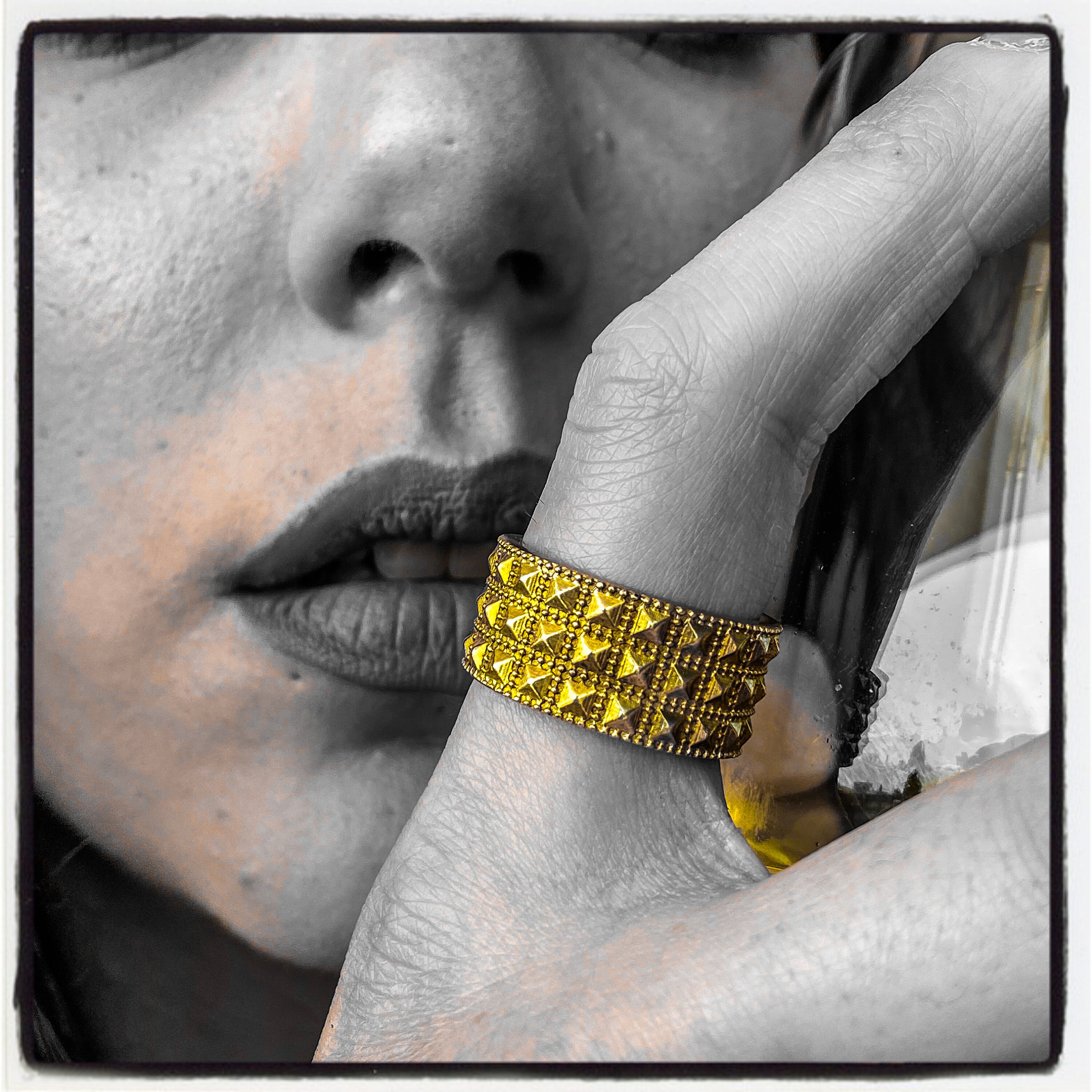 This is a genuine Handmade Pyramid Studded Band Ring handmade by World Renowned Award Winning Master Goldsmith Marcus Platrides on the Greek Island of Cyprus in Europe.