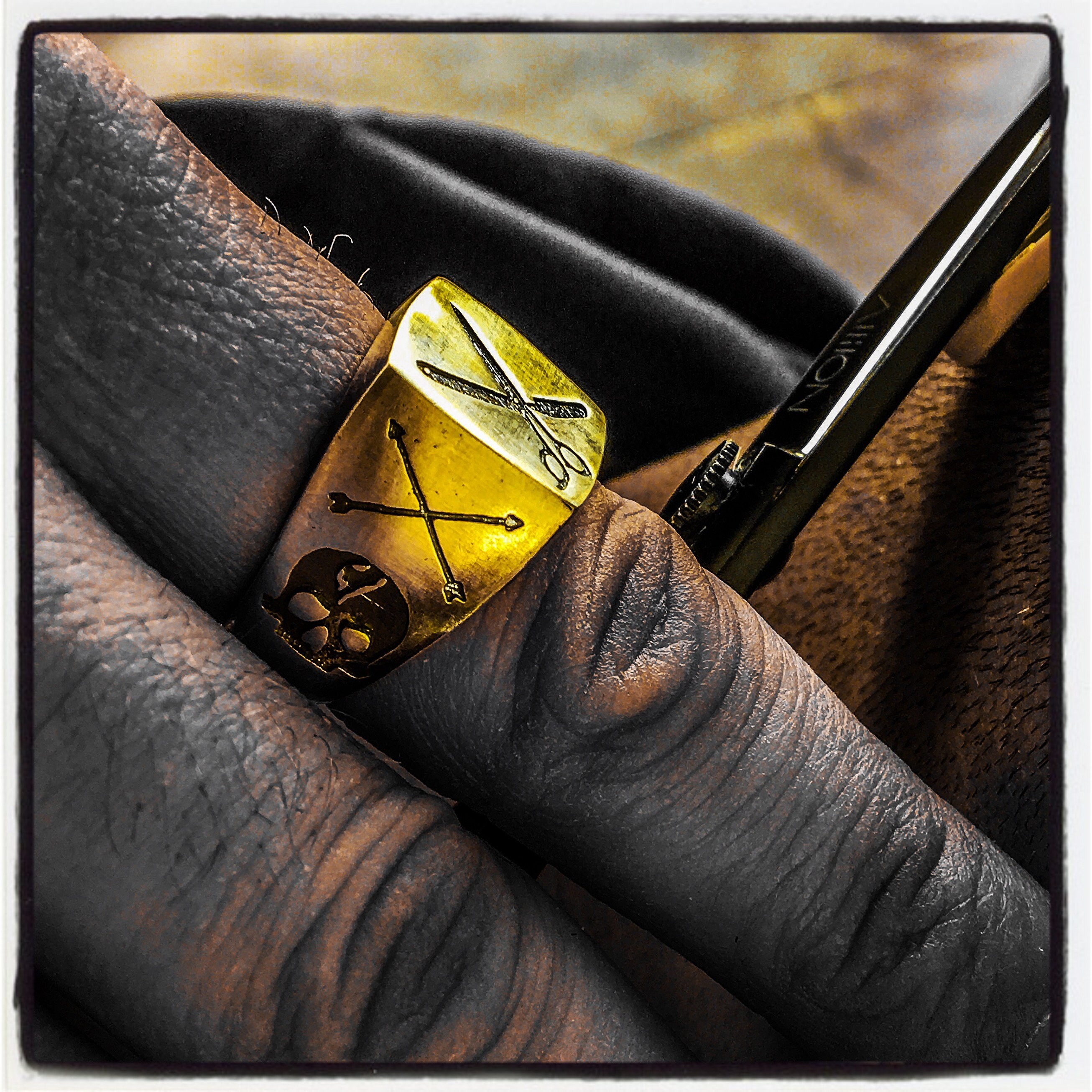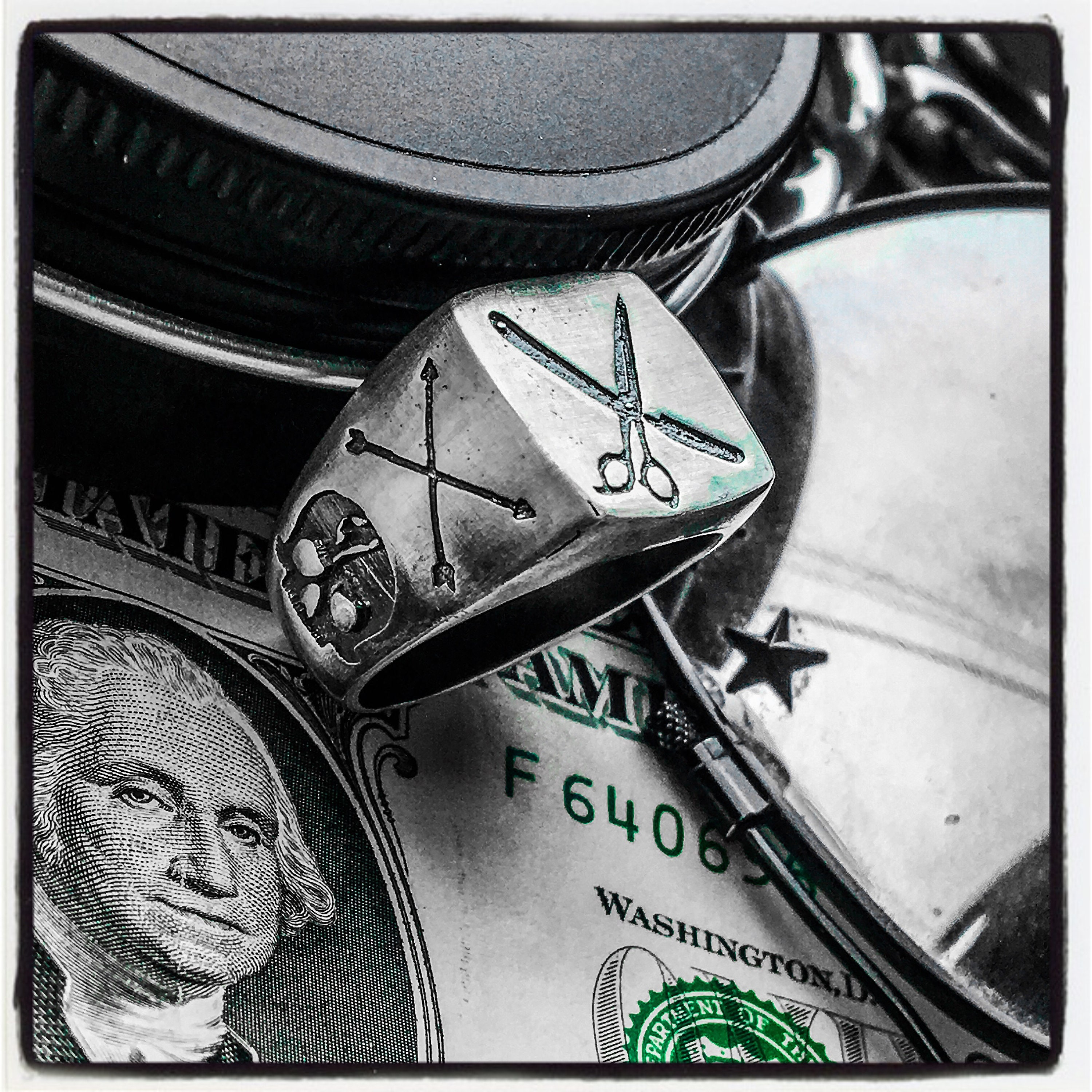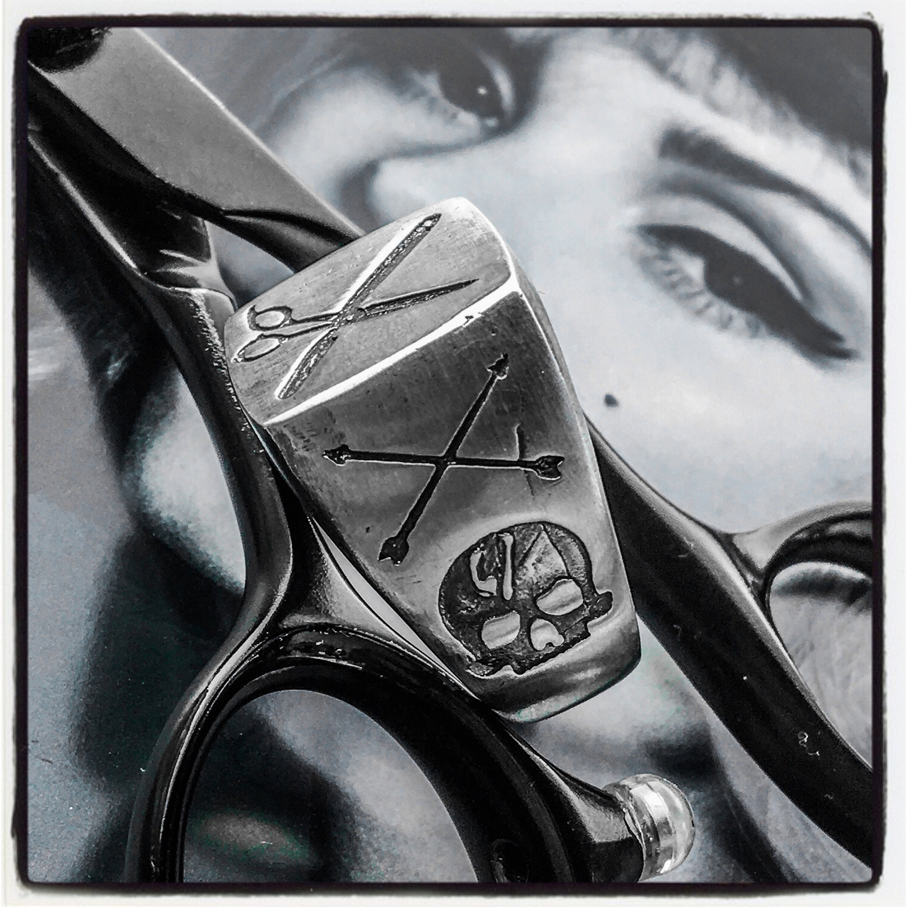 Dies ist eine echte handgefertigte Sterling Silber Rasierer, Schere und Schädel Ring handgefertigt von World Renowned Award Winning Goldsmith Marcus Platrides auf der griechischen Insel Zypern in Europa.